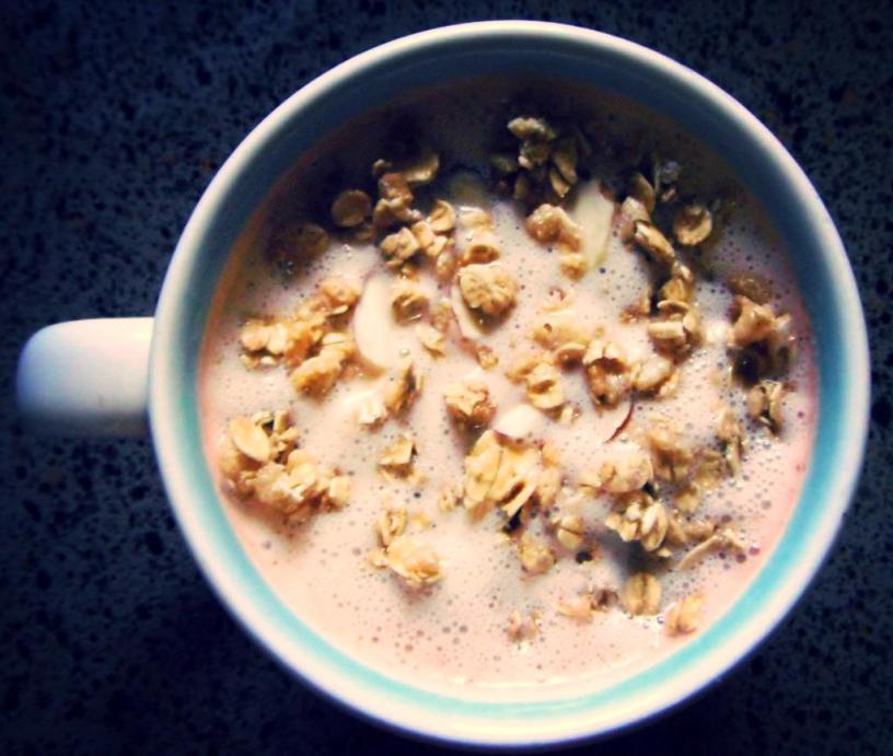 I take many sayings a bit more seriously than I should, but I admit I can be a bit dismissive when people say that breakfast is truly the most important meal of the day. It’s time I take this to heart, and go back to some wonderfully simple treats I made a long time ago, now that I’ve purchased a blender. What you see is “Fragola Granola”. It’s a smoothie of sorts, topped with your favorite brand of granola, cereal, chopped fruit, or any other of your preferred toppings. I can see this being liked by children and teens during the bustle of busy mornings. I can also think of several adults, including myself, who could use a quick, nutritious breakfast made in ten minutes’ time.